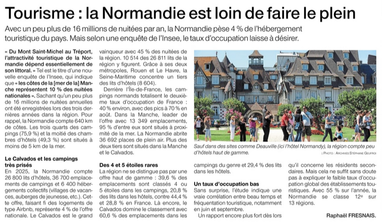 A partir d'une étude plus globale sur l'attractivité normande, un sérieux problème est posé quant aux raisons d'un "peut mieux faire". Le Mont Saint Michel, les plages du débarquement et Etretat sont des cache-misère plus que des arbres qui masquent la forêt. Du surtourisme à certains endroits, des visiteurs du weekend à Deauville, trop peu par ailleurs sauf à des points qui ont un succès d'estime relatif (Bagnoles de l'Orne, Suisse normande). Le tourisme est une activité ayant une instabilité multifactorielle, toujours bonne à prendre mais impactée par niveau de vie, mode, aléas géopolitiques qui ne permettent pas d'assurer un plan de développement avec beaucoup de certitudes.